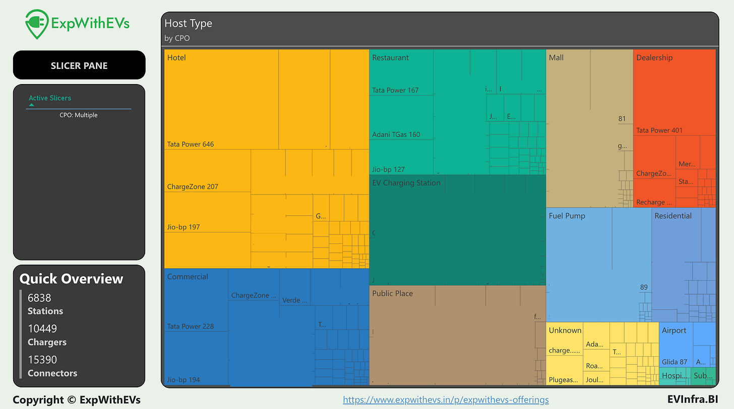 Adani TGas will overtake Tata Power as the most number of chargers at Restaurants in the next report. ChargeZone and Jio-bp are competing to take the second spot in the Hotel category. ChargeZone isn’t surprising because there’s a quick recall - “Oh Marriott brands have ChargeZone chargers” (Data check - almost 40% of ChargeZone’s Hotel host chargers are in Marriott). There’s value to have a strong brand associated with your CPO brand.