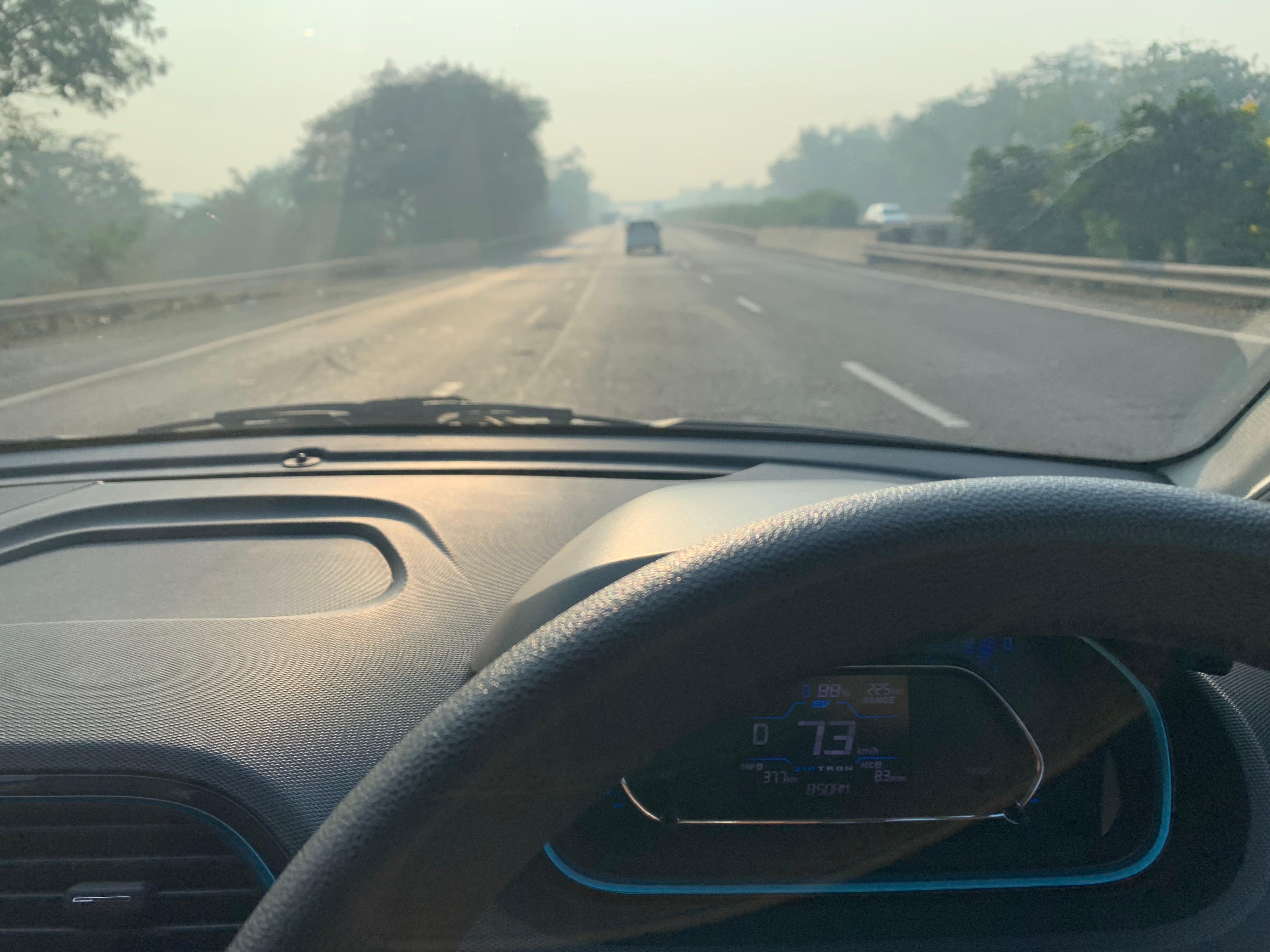 When I started driving, the consumption was hovering slightly above 100 wh/km (10 km/kwh) and this was without regen active (since the battery pack was 100% full). Seeing this number itself, I was glad that the car was an efficient beast when compared to an MG, which would usually be around 8 km/kwh (125 wh/km).